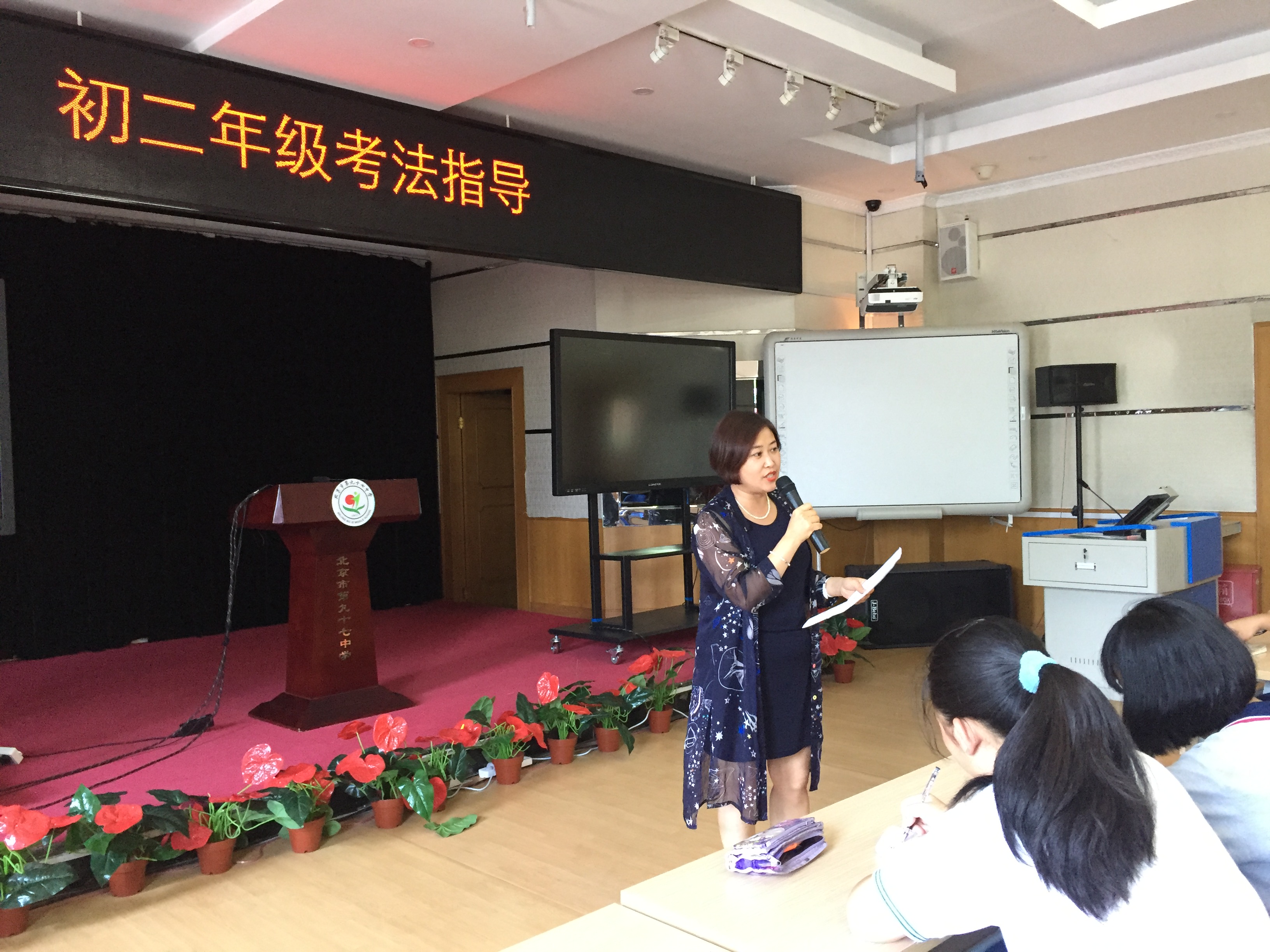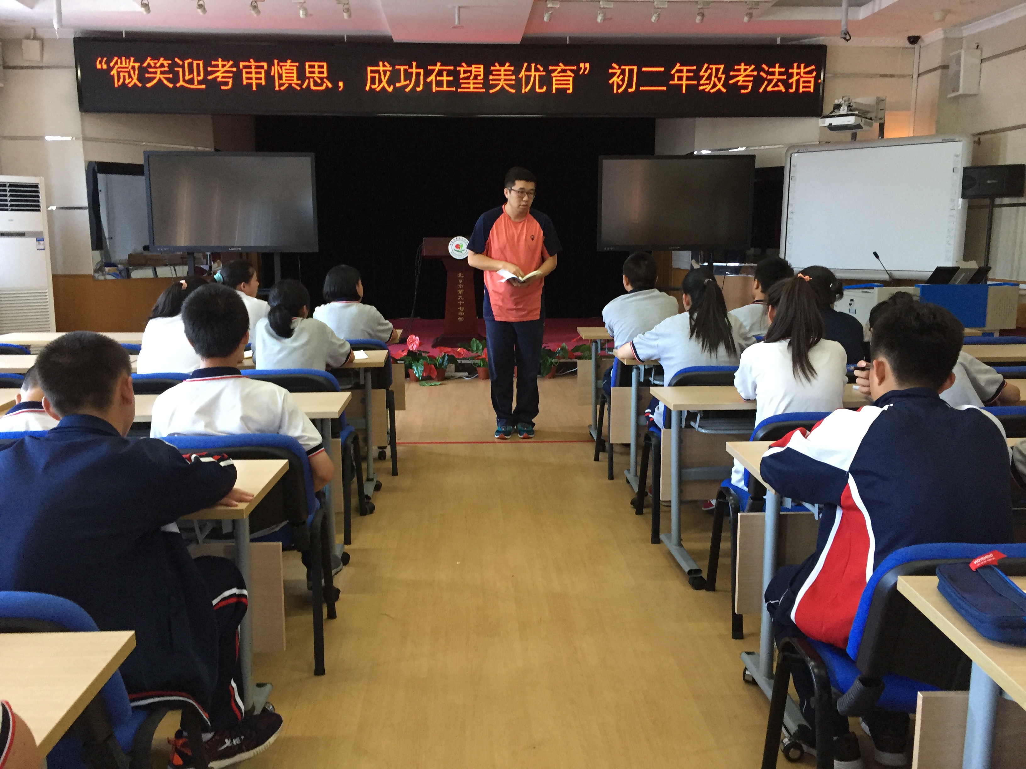 2018年7月3日,期末复习阶段,北京市第九十七中学初二年级组在综合厅,开展了“微笑迎考审慎思,成功在望美优育”之初二年级考法指导会。本次考法指导,指导教师代表有语文组教师李飞、数学组教师王雪峰、英语组教师孙素岩、物理组教师张欣和史地政生组教师张欣、陈连京、吴骅、崔文雯。语、数、英组的其他老师也来到现场,与同学们一起聆听备考策略。