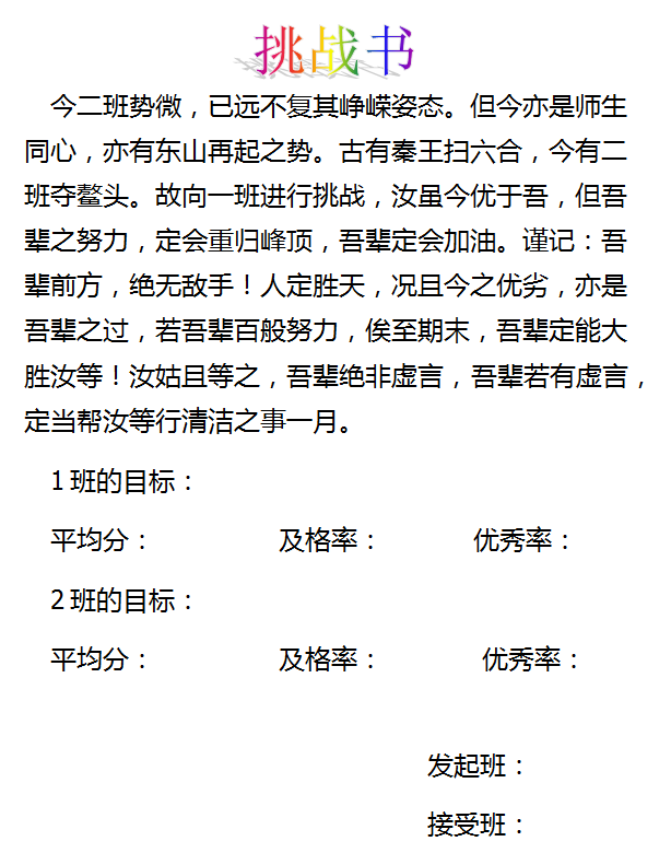 班级挑战赛,以挑战与竞争开始,以合作共赢,携手并进为目标。同学们激动地说“这就是一场没有硝烟的战争!我们要以最好的状态来迎战这场挑战!相信充满竞争的年级定会焕发无限生机,相信充满挑战的班级定会创造更多惊喜!愿每一位同学都能在挑战中再接再厉,拼出更好的自己,收获更明媚的未来!